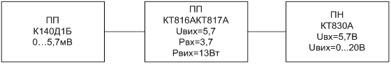 Рисунок 5 – Детальна структурна схема ПП – первинний перетворювач, призначений для перетворення струму у напругу. Схема віднімання основана на ОП К140Д1Б. Межі вихідної напруги 0...5,7В. ПП – підсилювач потужності, використовується для забезпечення потужності на навантаженні. Оснований на БТ КТ816А і КТ817А. ПН – підсилювач напруги, призначений для підсилення величини вихідного сигналу по напрузі до 20В. Таким чином на виході даного каскаду отримуємо напругу 0...20В. Оснований на транзисторі КТ830А Закінчивши попередню розробку структурної схеми, маємо схему, розбиту на декілька каскадів, внаслідок чого, для кожного з каскадів зроб-лений попередній розрахунок. Тобто визначені динамічні діапазони, коефі-цієнти підсилення, максимальні значення струмів, напруг, потужностей, вибрані згідно розрахункам операційні підсилювачі, транзистори. Принцип роботи перетворювача заключається у наступному. Генератор імпульсів виробляє сигнал, що подається на вхід ОП, після його перетворення він потрапляє на каскад підсилення потужності, а згодом і в каскад підсилення напруги. Так як з ОП напруга виходить досить малою то виникає необхідність її підсилення по напрузі та стабілізації та підсилення по потужності, саме тому у схемі і використовуємо підсилювачі напруги та потужності що побудовані на транзисторах. 3. Електричні розрахунки 3.1 Електричний розрахунок підсилювача потужності Електричний розрахунок виконуємо за допомогою електричної принципової схеми , яка зображена на рисунку 6.