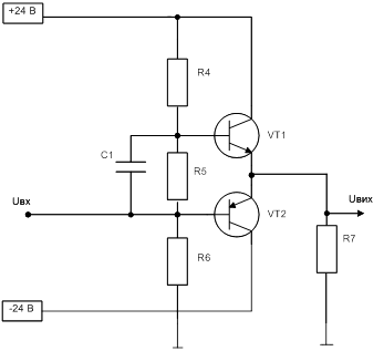 2.4 Попередній розрахунок підсилювача потужності В якості підсилювача потужності використаємо підсилювальний каскад такий, як комплементарний емітерний повторювач (див.рисунок 4). Розрахуємо потужність на виході даного каскаду. Початкові дані: