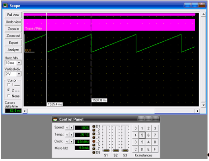 Рисунок 8 – Результат работы в режиме 8. 5. АНАЛИЗ ВРЕМЕННЫХ СООТНОШЕНИЙ И ОЦЕНКА ПОГРЕШНОСТЕЙ Чтобы рассчитать константу k, которую необходимо поместить в регистр сравнения таймера Т1, разделим тактовую частоту процессора на 256, так как за 256 прерываний от таймера формируется 1 период пилообразного напряжения: 4 МГц/256=15625 Гц. Теперь, чтобы определить необходимую константу, разделим 15625 Гц на требуемую частоту сигнала. Проведём, к примеру, расчет для частоты сигнала 8 Гц: k=15625 Гц/8 Гц=1953,125. Чтобы поместить полученное значение в регистр сравнения, его необходимо округлить и преобразовать в шестнадцатеричную форму: k=$07A1. Так как почти все рассчитанные значения приходится округлять, это вызывает погрешности в формировании частоты. Анализируя полученные значения частот в пакете VMLAB, можно сделать вывод о том, что погрешности не превышают предел в 1%, который определён в задании. ВЫВОДЫ В процессе выполнения курсового проекта была разработана схема программно управляемого генератора линейно-нарастающего напряжения сверхнизкой частоты, а также был составлен алгоритм и текст программы функционирования прибора. Полученное устройство обладает следующими характеристиками: - возможность установки 8 фиксированных значений частоты сигнала (8, 10, 12, 14, 16, 18, 20, 22 Гц) 8-ю кнопками; - амплитуда сигнала плавно изменяется в пределах от 0 до 15 В переменным резистором; - индикация амплитуды осуществляется с помощью 8-ми светодиодов. В результате эмуляции работы генератора в пакете VMLAB оценены погрешности установки частоты, которые не превышают 1%. ПРИЛОЖЕНИЕ 1 ПЕРЕЧЕНЬ ЭЛЕМЕНТОВ