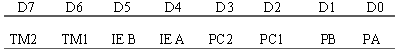 А0 – А2 – соответственно маски RST 5.5, RST 6.5, RST 7.5; А3 – разрешение установки маски; А4 – сброс триггера приема запроса RST 7.5; А5 – не используется; А6 – разрешение вывода данных; А7 – бит данных для вывода через SOD. Установка маски запрещает соответствующее прерывание. Смена маски в соответствии с А0 – А2 выполняется только при разрешении ее установки (А3 = 1). В противном случае функция установки маски подавляется. Для маски прерывания RST 6.5 содержимое аккумулятора будет следующим ( Dh ): A7 = 0; A6 = 0; A5 = 0; A4 = 0; A3 = 1; A2 = 1; A1 = 0; A0 = 1.