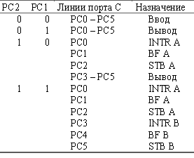 Биты РА и РВ управляющего слова задают направление передачи данных через порты РА и РВ ( 0 – ввод, 1 – вывод). Биты РС2 и РС1 определяют вариант использования порта С в соответствии с таблицей:
