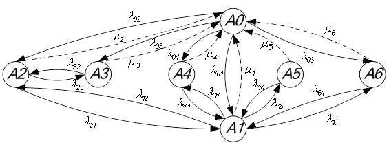 Рисунок 11 - Диаграмма графа, моделирующего поведение системы с учетом процессов технического обслуживания По полученному графу составим систему уравнений Колмогорова-Чепмена:
