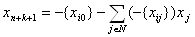 3. Додамо умови (18, 19) до умов (£k, C) – задачі. Одержимо нову (£k+1, C) – задачу. Тому що оптимальне рішення x(£k, C) (£k, C) – задачі визначало одну з вершин багатогранника умов, то воно може бути обране в якості первісного опорного рішення для знову отриманої задачі. А це означає, що останню симплексну таблицю (£k, C) – задачі можна взяти в якості вихідної для (£k+1, C) – задачі, доповнивши її умовою (18). Отже, симплексна таблиця для (£k+1, C) – задачі виходить із останньої симплексної таблиці для (£k, C) – задачі шляхом облямівки (i+1) – й рядком з елементами: