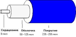 Среди геометрических параметров ОВ выделяют параметры кварцевого световода и параметры покрытия. Первые являются наиболее существенными и определяют тип световода. Наиболее важный параметр ОВ - диаметр сердцевины, поскольку геометрические размеры и профиль показателя преломления сердцевины определяют модовый состав ОВ. Под диаметром сердцевины понимают диаметр центральной области ОВ с высоким значением показателя преломления. Под диаметром сердцевины понимают диаметр по уровню 0.1 от максимального значения коэффициента преломления (на оси ОВ). Структура ОВ с указанием типичных параметров показана на рис.4.