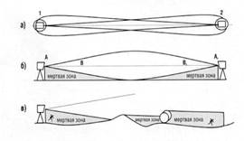 Радіопроменеві системи містять передавачі і приймачі з вузьконаправленими антенами. Використовуваний діапазон частот звичайно лежить в межах від 10 до 40 ГГц. Перетин радіопроменя в горизонтальній (а) і вертикальній (б) площинах показаний на Мал. 13. Робочою зоною радіопроменевих систем вважають зону на ділянці ВС|. На ділянці АВ| промінь дуже вузький, і його можна обійти. На ділянці З площа поперечного перетину променя дуже велика в порівнянні з площею потенційного порушника, і що виявляє здатність системи виявляється зниженою. В той же час, наявність променя на достатньо протяжній ділянці CD за межами робочої зони накладає серйозні обмеження на мінімальні розміри зони відчуження. При використанні одиночних суміщених передавачів приймача типу радіолокаторів зона відчуження повинна перевищувати розміри ділянки CD. При тому, що розноситься приймача 2 і передавача 1 по різні кінці зони (рис.20 а) вимоги, що охороняється, до зони відчуження знижуються, але все таки залишаються із-за наявності мертвих зон поблизу передавача і приймача (рис 20 б). Фактично робоча зона поміщена між крапками В і B1, а ділянки АВ| і B1A1 виходять за межі зони, що охороняється [12]. Вони можуть бути віднесені до зон відчуження. Мертві зони утворюються і від затінювання радіопроменя складками місцевості і сторонніми предметами, розташованими на лінії охорони (рис 21 в).
