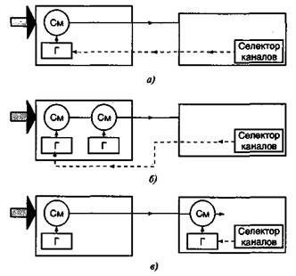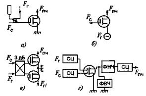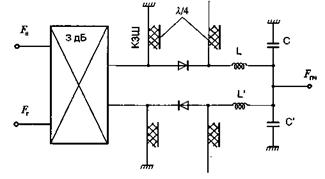 Рисунок.. 4.10. Принцип построения балансного смесителя СВЧ Удачным вариантом балансного смесителя без использования трехдецибельного моста является конструкция, приведенная на рис. 4.11. По сигнальной цепи оба диода размещены на расстоянии полуволны, поэтому их нагрузочные сопротивления включены параллельно. По гетеродинной цепи диоды включены параллельно, что тоже надо учитывать при согласовании этого смесителя с гетеродином. Обладая многими достоинствами (низким коэффициентом шума, высокой линейностью, простотой конструкции), представленная схема смесителя имеет один существенный недостаток — ослабляет преобразуемый сигнал. Этого недостатка лишены транзисторные смесители, выполненные на ПТШ и обеспечивающие при приемлемом значении коэффициента шума (4,5 — 6,0 дБ) усиление сигнала на 5— 10 дБ. Вначале использовались конструкции смесителей с однозатворными ПТШ, сигнал гетеродина на которые подавался одним из способов, показанных на рис. 4.12. Схема на рис. 4.12, а требует слабой связи направленного ответвителя и, следовательно, повышенной мощности гетеродина. Недостатком схемы на рис. 4.12, б является наличие в цепи обратной связи сопротивления, вносимого гетеродином, что приводит к снижению усиления и увеличению коэффициента шума. Схема на рис. 4.12, в наиболее удобна с точки зрения подачи напряжения сигнала и гетеродина, однако колебания напряжения ПЧ на стоках оказываются противофазными и полоса пропускания ограничивается полосой суммирующей цепи. Кроме того, требуется тщательное согласование цепи затворов на частотах сигнала и гетеродина. Наилучшие результаты получаются при использовании смесителей с двухзатворными ПТШ. Напряжения сигнала и гетеродина прикладываются к разным затворам, и нужна только одна фильтрующе-согласующая схема в цепи стока (рис. 4.12, г, где СЦ — согласующая цепь, ФНЧ и ФВЧ — фильтры нижних и верхних частот). Главное преимуще ство схемы с двухзатворным ПТШ — ее простота.