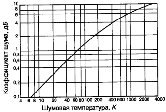 Рисунок.. 4.4. Зависимость коэффициента шума от шумовой температуры На входе конвертора всегда присутствует малошумящий усилитель, состоящий из нескольких усилительных каскадов (обычно 2—4), каждый из которых имеет собственный коэффициент шума и коэффициент передачи номинальной мощностир (kрном). Рассмотрим влияние параметров отдельных каскадов на шумовые характеристики тракта в целом. Для этого объединим все п каскадов в один, с коэффициентом передачи номинальной мощности