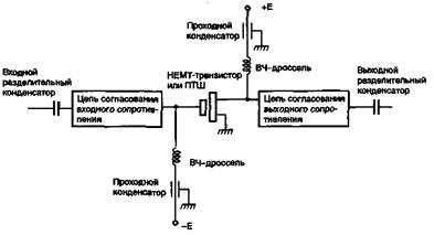 Из выражения (4.3) следует, что коэффициент шума многокаскадной схемы в основном определяется коэффициентом шума первых каскадов. Справедливость этого утверждения увеличивается с возрастанием коэффициентов передачи их номинальной мощности. Поэтому для получения малого коэффициента шума всего приемного тракта необходимо, чтобы его первые каскады имели малый уровень собственных шумов и обеспечивали большое усиление сигнала по мощности. Из всего вышесказанного можно сделать вывод о чрезвычайной важности таких параметров конвертора (в частности, первых каскадов МШУ), как коэффициент усиления и коэффициент шума. Практически входные и выходные согласующие цепи первого транзистора рассчитываются на минимальный коэффициент шума, второй каскад настраивается из компромиссных соображений: максимальное усиление при минимальном коэффициенте шума. Влияние коэффициента шума третьего каскада практически неощутимо. Итак, классический МШУ состоит из трех усилительных каскадов: первые два выполнены на НЕМТ-транзисторах, третий — на транзисторе с барьером Шотки. Все каскады МШУ строятся, как правило, на несимметричных полосковых линиях передачи, которые выполняются методом напыления проводящих материалов на керамическую подложку. В СВЧ-диапазоне паразитные реактивные элементы корпуса транзистора оказывают заметное влияние на характеристики МШУ. Чтобы исключить этот эффект, применяют транзисторы в бескорпусном исполнении. Каждый усилительный каскад (рис. 4.5) состоит из четырех цепей: входной и выходной цепей, цепи смещения и активного элемента.