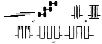 Рисунок.. 4.6. Полосовые фильтры СВЧ: а — лестничные; б — шпилечные; в — решетчатые Центральная частота фильтра зависит от длины полосковых элементов, а ширина полосы пропускания — от ширины линий и расстояния между ними. Чем больше число звеньев фильтра, тем круче его амплитудно-частотная характеристика, но также выше и вносимое затухание. Амплитудно-частотная характеристика полосового фильтра, выполненного на связанных полуволновых резонаторах, представлена на рис. 4.7.