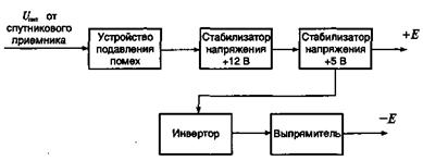 Рисунок.. 4.12. Смесительные каскады на полевых транзисторах с барьером Шотки Предварительный усилитель промежуточной частотыУсиление конвертора обеспечивается, главным образом, ПУПЧ. Поскольку к нему не предъявляется жестких требований по коэффициенту шума, он может быть выполнен на биполярных слабосигнальных транзисторах: МОП- транзисторах, ПТШ и гибридных модулях усиления, а также их комбинациях. Так как усиление с увеличением частоты падает, ПУПЧ должен иметь соответствующие согласующие цепи для компенсации избыточного усиления на низких частотах. Неравномерность АЧХ должна быть не более ±2 дБ. Устройство питанияУстройство питания предназначено для обеспечения высокостабильного разнополярного относительно корпуса напряжения питания, необходимого для нормального функционирования всех узлов конвертора. Напряжение питания +12 В относительно корпуса подается на конвертор с приемного устройства по центральной жиле коаксиального соединительного кабеля. К узлу электропитания предъявляются следующие требования: > Не создавать электрических помех > Обеспечить узлы конвертора стабильным напряжением питания На рисунке 4.13 представлена типовая функциональная схема устройства питания конвертора.