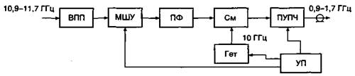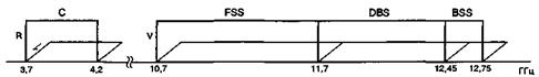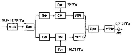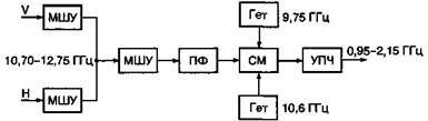 Рисунок.. 4.14. Полосы частот С- и Ки-диапазонов Данная задача была успешно решена с появлением широкополосных НЕМТ-транзисторов с низким коэффициентом шума. Структурная схема полнодиапазонного конвертора представлена на рис. 4.15. Он имеет один МШУ, а разделение диапазонов происходит в полосовом фильтре ПФ, при этом обработка сигналов в диапазонах DBS и Telecom совмещается. Каждый диапазон (10,7—11,7 и 11,70—12,75 ГГц) имеет свой смеситель и гетеродин, но общий ПУПЧ. Одним из преимуществ такой конструкции является возможность плавной подстройки поляризации.