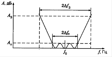Рисунок.. 4.7. Частотная характеристика полосового фильтра: А3 — заданная величина затухания, соответствующая полосе заграждения 2∆f3; Аn — величина затухания, соответствующая полосе пропускания 2∆fn:f0—средняя частота полосы пропускания ГетеродинВ большинстве современных конструкций гетеродин — это неперестраиваемый (в отличие от гетеродинов, используемых в радиовещательных приемниках) маломощный высокостабильный генератор электрических колебаний. Основной характеристикой гетеродина является нестабильность номинальной частоты fH. Под нестабильностью частоты понимаются случайные и систематические изменения частоты во времени. Вследствие воздействия дестабилизирующих факторов (температуры, давления, вибрации, отклонения питающего напряжения) частота гетеродина отклоняется от номинального значения. При этом различают абсолютное и относительное отклонение частоты. Под абсолютным отклонением понимают разность между фактической частотой генератора и ее номинальным значением аН0М, под относительным отклонением — отношение абсолютного отклонения к номинальному значению частоты генератора fном. Из множества дестабилизирующих факторов наибольшее влияние на отклонение частоты гетеродина оказывает изменение температуры окружающей среды. Для характеристики этого влияния используется температурный коэффициент частоты КТ в заданном интервале температур (Tmax—Tmin):