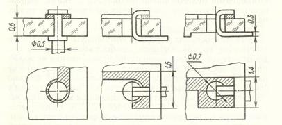Рисунок 3 Варианты конструктивного выполнения внешних контактных площадок и выводов Автоматизированный монтаж указанных компонентов требует размеров контактных площадок не менее 0,6 х 0,6 мм, а компонентов с шариковыми выводами 0,25 х 0,25 мм с расстоянием между контактными площадками 0,1 мм, если шаг выводов навесных компонентов 0,35 мм. Проводники и контактные площадки для присоединения навесных компонентов с целью повышения надежности и уменьшения сопротивления рекомендуется лудить серебряно-оловянным припоем. При монтаже навесных компонентов с шариковыми выводами проводники целесообразно покрывать пленкой защитного диэлектрика, оставляя открытыми лишь контактные площадки. Пленка диэлектрика должна отстоять от края контактной площадки на 0,5 мм. Варианты исполнения внешних контактных площадок и конструкций внешних выводов платы показаны на рисунке 3. Навесные компоненты. Навесными компонентами могут быть бескорпусные диоды и транзисторы, диодные и транзисторые матрицы, бескорпусные полупроводниковые микросхемы, диоды и транзисторы в миниатюрных корпусах, а также конденсаторы и трансформаторы с гибкими и жесткими выводами. Навесные компоненты рекомендуется располагать рядами на одной стороне платы. Допускается устанавливать их на резисторах и проводниках, защищенных диэлектрической пленкой. Места расположения навесных компонентов целесообразно обозначать метками, выполненными с помощью резистивных или диэлектрических паст. В целях унификации необходимо применять в однотипных микросхемах навесные компоненты с одинаковым диаметром гибких выводов, длина гибкого вывода без дополнительного крепления путем приклеивания не должна превышать 2,5 мм. Минимальное расстояние между навесным компонентом и контактной площадкой должно составлять при пайке 0,8 мм. Расстояние между луженым проводником или контактной площадкой и навесным компонентом должно быть не менее 0,2 мм. Наименьшее расстояние от навесного компонента до края платы 1 мм. Резисторы. Количество резистивных слоев на одной стороне подложки, выполненных с помощью паст с различным удельным сопротивлением, может составлять не более трех. Целесообразно ориентировать резисторы на плате одинаково, т. е. располагать их длинными или короткими сторонами параллельно друг другу. На одной стороне платы рекомендуется размещать резисторы, близкие по номинальным значениям сопротивлений. Минимальный размер резисторов 0,8x0,8 мм. Изготавливать резисторы в виде меандра не рекомендуется. Если принципиальная электрическая схема не предусматривает внешних контактов для каждого подгоняемого резистора, то для обеспечения контроля сопротивления в процессе лазерной подгонки необходимо при разработке топологии создавать временные проволочные перемычки или даже временные внешние выводы, которые после подгонки резисторов удаляются. Конденсаторы и межслойная изоляция. Пленочные конденсаторы не должны располагаться на той стороне платы, которая при герметизации заливается компаундом. Между контактной площадкой навесного конденсатора, присоединяемого пайкой, и активным компонентом необходимо предусмотреть расстояние не менее 1 мм. Круглые отверстия в межслойной изоляции, служащие для контакта между проводниками различных уровней, должны иметь диаметр не менее 0,6 мм. 