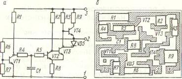 Рисунок 4. Электрическая принципиальная схема (а) и эскиз топологии (б) тактового генератора в толстопленочном исполнении. Разработка эскиза топологии. Эскиз топологии следует выполнять на миллиметровой бумаге в масштабе 10:1. Шаг координатной сетки рекомендуется выбирать равным 0,1 мм. Необходимо учитывать, что коэффициент заполнения площади платы элементами, расположенными на одном уровне, не должен превышать 0,7. Минимальное расстояние от края отверстия до края платы должно составлять 0,5 мм. Точность изготовления резистивных и диэлектрических пленочных элементов не превышает ±0,1 мм. Пример эскиза топологии приведен на рисунке 4. Поскольку в состав проводниковых и резистивных паст входят редкие и благородные металлы, это заставляет учитывать расход данных материалов. Чем меньше площадь пленочных проводников и резисторов, тем экономичнее производство микросхемы. Разумеется, размеры подложки и расход диэлектрических паст также влияют на стоимость. ЛИТЕРАТУРА 1. Конструкторско-технологическое проектирование электронной аппаратуры. Учебник для вузов. К.И. Билибин, А.И. Власов, В.В. Журавлев под редакцией В.Н. Шахнова. М.: МГТУ им. Баумана, 2002 г. 2. Образцов Н.С.. Ткачук А.М.. Куракина Э.П. Телообмен в РЭА. Конспект лекций по курсу «Конструирование радиоэлектронных устройств» - Мн.: БГУИР, 2003 – 54 с. 3. Образцов Н.С. и др. Печатные платы в конструкциях РЭС. Учебное пособие по курсу «Конструирование Радиоэлектронных устройств» / Под редакцией Ж.С.Воробьевой и Н.С.Образцова. – Мн.: БГУИР, 1999 – 141 с. 4. Воробьева Ж.С., Образцов Н.С. и др. основы конструирования изделий радиоэлектроники. Учебное пособие. – Мн.: БГУИР, 2001 – 226 с. 5. А.А. Шмигевич. Проектирование несущих конструкций электронных устройств. Учебное пособие для студентов инж.-тех.вузов. Мн.: «Адукация и выхованне». 2003 – 308 с. |
