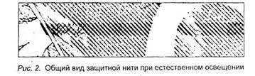 Защитные нити Защитная нить представляет собой полимерную или металлизированную тонкую полоску, шириной 0,7 – 1,5 мм, которая вводится в бумагу в процессе отлива бумажной массы. Наиболее часто нити располагаются полностью в тоще бумаги и видимы только на просвет, реже встречаются защитные нити, выступающие на поверхность бумаги в виде пунктира, так называемые «плавающие» («ныряющие») нити (рис. 2, 3). На просвет она выглядит как единое целое. Защитные нити также могут иметь различные надписи, микротексты, знаки и т.д. Ряд нитей обладают свечением в УФ-лучах или магнитными свойствами.