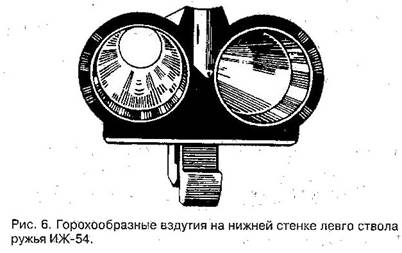 грязь. Чистый ствол ружья нужно направить на экран, лучше всего на край оконной рамы, т. е. на линию, разделяющую светлый и темный фон (это днем, а при вечернем освещении - на зеркало). Каналы ствола представятся в виде ряда темных и светлых колец, это - отражения концевых обрезов стволов на поверхности канала, при этом колец будет немного; если же вложить в патронник пустую гильзу без капсюля, то через капсюльное гнездо будет видно великое множество концентрических колец, если смотреть с дульной части ствола. При правильной сверловке стволов все эти кольца должны иметь вид строго правильных концентрично расположенных кругов: расстояния между двумя соседними кольцами должны быть со всех сторон одинаковыми. 1. 1.9.3. Искривление стволов пайкой и планками В двуствольных ружьях, даже очень высоких сортов, при спайке стволов и прикреплении планок нередки случаи искривления стволов. Эти искривления могут быть в любом, чаще всего в самом тонком месте (в данном случае ствол несколько погнут дугой). Как видно, часть колец смещена в ту сторону, куда выгнут ствол: на вогнутой стороне дуги часть колец очень сближена, а на противоположной - разведена. Бывает и наоборот: опасаясь так называемого стягивания стволов пайкой, их слишком разводят, и они искривляются в другую сторону; но это случается довольно редко. Искривленные стволы могут бить кучно при том условии, если снарядные входы и дульные сужения хорошо высверлены; резко они бить не могут. Кроме того, у таких стволов всегда будет снос центра дробовой осыпи в сторону искривления. Осмотр каналов стволов нужно производить с казенной и дульной части. Искривление стволов вследствие их спайки между собой ремонту не поддается. Прицельную планку можно перепаять или у опытного оружейного мастера, или на оружейном заводе. 1.1.9.4. Дефекты сверловки Неправильности сверловки - местные выхваты, расширения, некачественность правки стволов, а также следы исправления раздутий и вмятин можно обнаружить по теневым треугольникам. Для осмотра нужно направить хорошо протертый, чистый ствол, как и в предыдущем случае, на любую линию экрана, разделяющую светлый и темный его фон, лучше всего на край оконной рамы, не в горизонтальном, а в наклонном положении по отношению к глазу. В канале ствола будет ясно виден темный теневой треугольник. При безукоризненной сверловке и правке этот треугольник должен быть правильным и равнобедренным. В стволе цилиндрической сверловки вершина его доходит до дульного обреза, а при чековой сверловке - заканчивается у начала дульного сужения. При этом со стороны дульной части ствола виден второй, малый, теневой треугольник, образованный дульным сужением. Вершины этих двух треугольников, если поднять стволы, соединяются. При осмотре ствол поворачивают в горизонтальном направлении вокруг своей оси: очертания сторон треугольников в этом случае не должны изменяться. Даже малейшее изменение очертаний треугольников указывает на тот или иной дефект сверловки. В стволе, имеющем выхваты, местные расширения или сужения канала, очертания треугольников будут иметь неправильную форму. Таким же порядком необходимо осмотреть стволы и с дула, чтобы проверить сверловку казенной части, ближе к патронникам. Дефекты очень существенны и неисправимы, надлежащего боя от ружья с такими дефектами по