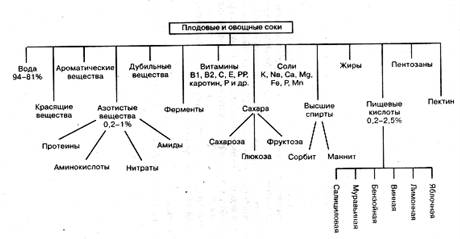 Рисунок 1- Химический состав плодовых и овощных соков Современная техника концентрирования соков, обеспечивающая сохранение почти всех биологически активных, красящих и питательных веществ в сочетании с улавливанием и возвратом летучих ароматических веществ, позволяет получать продукты, мало отличающиеся от натуральных соков. Поэтому как в странах-производителях, так и в местах потребления концентрированные соки находят разнообразное применение. Их не только восстанавливают в исходные соки, но и используют для получения купажированных соков, соков-напитков, различных видов освежающих безалкогольных напитков, в кулинарии, для подслащивания вин. Концентрированные соки, имеющие интенсивную окраску (вишневый, черничный) или сильно выраженный приятный аромат (малиновый, ежевичный, земляничный), применяют для улучшения цвета и ароматизации пищевых продуктов. Плодово-ягодные концентрированные соки с мякотью используют для приготовления нектаров, мармелада, различных кремов, мороженого, фруктового йогурта, продуктов детского питания и в качестве начинки для конфет. Для концентрированных плодово-ягодных соков требуется в 3 - 7 раз меньше тары, транспортных средств и складских помещений по сравнению с соками однократной концентрации. Концентрированные соки хорошо и длительно хранятся без стерилизации и добавления консервантов, не замерзают при понижении температуры до - 18 °С. Поэтому в последние годы соки экспортируются в основном в концентрированном виде.[19, с.167] 2. Факторы, формирующие качество соков 2.1 Технология производства Основными факторами, формирующими качества соков является технология производства, качество сырья для производства. Производство фруктовых и овощных соков При производстве как осветленных, так и неосветленных соков все составные части, растворенные в воде (сахара, кислоты, витамины, минеральные вещества, пектиновые вещества, аминокислоты), почти полностью переходят в сок, а нерастворимые или малорастворимые (полисахариды, липиды, каротиноиды, некоторые другие вещества) остаются в большей или меньшей степени в выжимках. Кроме того, на состав оказывают действие ферменты, тепловая обработка, сроки и условия хранения, так как может происходить преобразование компонентов, их потеря или образование новых веществ. При тепловой обработке и дальнейшем хранении могут изменяться органолептические показатели, уменьшаться пищевая и биологическая ценность. Соки получают по следующей технологической схеме [8, c. 93]. 1. Подготовка сырья. Плоды используют свежие или замороженные, здоровые, в соответствующей степени зрелости. Воду используют пищевую, столовую, частично или полностью деминерализованную (преимущественно для восстановления концентрированных плодово-ягодных соков). Сахара — свекловичный, тростниковый, глюкозу, фруктозу, декстрозу, крахмальный сахар (патоку) — переводят в жидкую фазу. Органические кислоты — в жидком состоянии (лимонная, яблочная, винная, молочная). Предусмотрена мойка плодов для удаления грязи, земли, уменьшения обсемененности; инспекция плодов — удаляют гнилые, мятые, незрелые плоды, а также посторонние примеси. 2. Измельчение плодов. Производят механическими способами — с помощью вальцовой дробилки с рифлеными валками, с помощью ножевой дробилки, центробежной терочной 