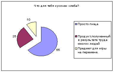 5% (или 1 человек) ответил, что если бы хлеб исчез с лица земли, то было бы меньше людей с лишним весом. Выводы На основе проделанной работы я пришла к следующим выводам: 1. Чтобы на полях вырастить зерно, днём и ночью, под палящими лучами солнца и проливными дождями трудятся тысячи людей более 120 профессий, поэтому хлеб издревле был для славян священным даром Богов и ассоциировался со всеми насущными житейскими потребностями. 2. Многие русские поэты, художники воспевали русское поле, нелегкий крестьянский труд, и плод этого труда – хлеб. 3. В годы Великой Отечественной войны люди ценой собственного здоровья, а подчас и жизни спасали хлеб, дающий жизнь тысячам других людей и в настоящее время для 1/6 населения планеты хлеб остаётся мало доступным. 4. Молодое поколение относится к хлебу как к чему-то привычному. 10 % опрошенных используют хлеб в качестве игры на перемене, что является показателем безнравственности моих сверстников. Хлеб не просто еда. Это тяжёлый труд тысяч людей, которые вложили в него свою душу, любовь, желая, чтобы плоды их труда приносили в каждый дом радость и благополучие. Многие в наши дни стали забывать истинную цену хлеба. Но есть люди, которые ещё помнят о том, как тяжело было раздобыть хлеб в войну. А сколько людей погибло от голода! Во имя их памяти мы должны дорожить хлебом, беречь то, что у нас есть. Список литературы 1. М. Ивин «Хлеб сегодня, хлеб завтра». Детская литература, 1980г. 2. А. Митяев «Ржаной хлебушко – калачу дедушка», Москва «Детская литература», 1990г. 3. М.А. Федоров «Юному хлеборобу», Москва «Россельхозиздат», 1984г. 4. Энциклопедия для детей (том 31) Древние цивилизации / М. Аксенова. Д. Володихин, И. Стрикалов– М.: Мир энциклопедий Аванта+, 2008г 5. Ожегов С.И., Шведова Н.Ю. Толковый словарь русского языка: 80 000 слов и фразеологических выражений / М.: Азбуковник, 1997 г 6. http:// kraushka.ru |