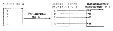 Мнения, согласно этой модели, представляют собой информацию, которую субъект имеет об объекте. Они связывают этот объект с каким-либо свойством. Например, мнение, что «употребление марихуаны не вредно для здоровья», связывает объект «употребление марихуаны» со свойством «здоровье» отношением «не вредно».[14] Прочность мнения - это воспринимаемая вероятность того, что объект связан со свойством, о котором идет речь. Чем прочнее мнение человека, тем более оно будет устойчиво к изменению. Мнения приобретаются не только из непосредственного опыта взаимодействия с объектом, но, также, и от других людей, групп, организаций, как в непосредственном общении, так и через средства массовой коммуникации. Установка определяется Фишбейном и Айзеном как набор отношений, которые имеет человек к объекту. Единственный компонент установки важный для эффективной пропаганды, с их точки зрения, это оценочный компонент. В то время как мнение отражает знание личности об объекте, установка обобщает ее отношение к нему. Мнения и установки должны быть согласованы между собой. Так, человек, который считает, что «употребление марихуаны не вредно для здоровья», скорее всего, имеет установку «я одобряю легализацию употребления марихуаны». Поведенческие намерения относятся к стремлению личности демонстрировать поведение, соответствующее мнениям и установкам относительно объекта. Сила намерения - вероятность того, что человек будет демонстрировать соответствующее поведение. Однако, существует много различных вариантов поведения, в целом соответствующих данному конкретному мнению или установке. Выбор определенного типа поведения зависит от оценки личностью последствий каждого из них (вероятность вознаграждения-наказания) и от нормативного давления на личность со стороны референтной группы. Человек, по Фишбейну, может иметь несколько мнений об объекте, некоторые из которых будут противоречить друг другу. Эти мнения могут также варьировать по своей прочности. Целостное впечатление, которое складывается из этих мнений об объекте, является информационной основой для соответствующих установок, намерений и поведения. Если мнение связывает объект с положительными свойствами, установка будет позитивной. Если же свойства - отрицательные, то установка будет негативной. Позитивные установки вызывают поведенческие намерения, поддерживающие объект, а негативные установки вызывают избегание объекта. Поведенческие намерения, в свою очередь, будут в целом соответствовать направленности установки. Как и мнения, намерения варьируют по силе (вероятности того, что они будут реализованы). Каждое намерение связано с определенной поведенческой реакцией. Установки и мнения относительно объекта связаны с целостной моделью поведения, а не с отдельными реакциями, поэтому, основываясь на них нельзя предсказать конкретно поведение субъекта.[15] Кроме поведенческих намерений, реальное поведение человека определяется также рядом других факторов, таких, например, как нормативное давление, прогноз последствий желаемого поведения и т.п. Однако, само сведение элементов убеждающей цепочки в единую модель предполагает их тенденцию к взаимному уравновешиванию: человек стремится к тому, чтобы его поведение в целом соответствовало его мнениям, намерениям и установкам