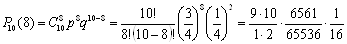 7,25 ≤ m0 ≤ 8,25 Þ m0 = 8 Наивероятнейшее число удачных опытов равно 8. Поскольку количество испытаний невелико (n = 10), то для нахождения вероятности того, что событие А появится точно k = 8 раз воспользуемся формулой Бернулли: