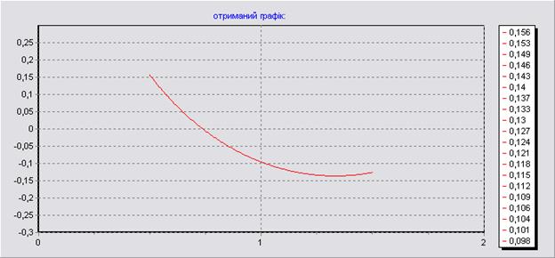 Розв’язання з використанням методу прогонки: unit Unit1; interface uses Windows, Messages, SysUtils, Variants, Classes, Graphics, Controls, Forms, Dialogs, ExtCtrls, StdCtrls, Buttons; type TForm1 = class(TForm) Panel1: TPanel; Label1: TLabel; Image1: TImage; Image2: TImage; Label2: TLabel; LabeledEdit1: TLabeledEdit; LabeledEdit2: TLabeledEdit; LabeledEdit3: TLabeledEdit; LabeledEdit4: TLabeledEdit; LabeledEdit5: TLabeledEdit; LabeledEdit6: TLabeledEdit; LabeledEdit7: TLabeledEdit; LabeledEdit8: TLabeledEdit; LabeledEdit9: TLabeledEdit; LabeledEdit10: TLabeledEdit; LabeledEdit11: TLabeledEdit; Label3: TLabel; Label4: TLabel; SpeedButton1: TSpeedButton; LabeledEdit12: TLabeledEdit; Label5: TLabel; Image3: TImage; procedure FormCreate(Sender: TObject); procedure SpeedButton1Click(Sender: TObject); private { Private declarations } public { Public declarations } end; var Form1: TForm1; type Dynmas=array of array of real; dynvec=array of real; var a,b,pi,qi,fi,a1,a2,b1,b2,AA,BB:real; eps,h:real; c:dynmas; st,m,i:integer; w_,v_,x,d,y,memory:dynvec; t_all,tx,ty,k_i:textfile; g:boolean; time1,time2,vremja:longint; str:string; implementation uses Unit2; {$R *.dfm} Function Timer:longint; const c60:longint=60; var h,m,s,s100:word; begin decodetime(now,h,m,s,s100); timer:=((h*c60+m)*c60+s)*100+s100; end; function progonka(n:Integer; a:dynmas; b:dynVec; var x:dynVec):boolean; Var i,j,k,l:Integer; q,m,t:real; ls:integer; Begin {прямой ход} w_[0]:=(-a[0,1]/a[0,0]); v_[0]:=(d[0]/a[0,0]); for i:=1 to n-1 do begin w_[i]:=-(a[i,i+1]/(a[i,i-1]*w_[i-1]+a[i,i])); v_[i]:=(d[i]-a[i,i-1]*v_[i-1])/(a[i,i-1]*w_[i-1]+a[i,i]); end; {w_[n]:= ; v_[n]:= ;} for i:=0 to n-1 do begin x[i]:=v_[i]+w_[i]*x[i+1]; end; x[n-1]:=v_[n-1]; {обратный ход} x[n-1]:=v_[n-1]; for i:=n-1 downto 0 do begin x[i]:=w_[i]*x[i+1]+v_[i]; end; {for k:=0 to n-2 do begin l:=-1; m:=0; for i:=k to n-1 do if Abs(a[i, k])>m then begin m:=Abs(a[i, k]); l:=i; end; if l=-1 then begin progonka:=false; Exit; end; if l<>k then begin For j:=0 to n-1 do begin t:=a[k,j]; a[k,j]:=a[l,j]; a[l,j]:=t; end; t:=b[k]; b[k]:=b[l]; b[l]:=t; end; for i:=k+1 to n-1 do begin q:=a[i,k]/a[k,k]; for j:=0 to n-1 do If j=k then a[i,j]:= 0 else a[i,j]:= a[i,j]-q*a[k,j]; b[i]:=b[i]-q*b[k]; end; end; if a[n-1,n-1]<>0 then x[n-1]:=b[n-1]/a[n-1,n-1] else begin progonka:=false; Exit; end; for i:=n-2 downto 0 do begin t:=0; for j:=1 to n-i do t:=t+a[i,i+j]*x[i+j]; x[i]:=(1/a[i,i])*(b[i]-t); end;} progonka := true; end; procedure Koef(var s:dynmas; k:integer; h:real; v:dynvec; var z:dynvec); var i:integer; begin s[0,0]:=h*a1-a2; s[0,1]:=a2; z[0]:=h*AA; for i:=0 to 2*(k-1) do begin s[i+1,i]:=1-(h*pi*ln(v[i]))/2; s[i+1,i+1]:=h*h*qi-2; s[i+1,i+2]:=1+(h*pi*ln(v[i]))/2; z[i+1]:=h*h*fi; end; s[2*k,2*k-1]:=-b2; s[2*k,2*k]:=h*b1+b2; z[2*k]:=h*BB; end; procedure TForm1.FormCreate(Sender: TObject); begin getdir(0,str); str:=str+'\otv\'; vremja:=0; end; procedure TForm1.SpeedButton1Click(Sender: TObject); begin if (form1.LabeledEdit1.Text='') and (form1.LabeledEdit9.Text='') and (form1.LabeledEdit12.Text='') then begin showmessage('так як ви не ввели коефіцієнти, то программа буде задіяна зі стандартним набором данних'); pi:=-1; qi:=-2; fi:=1; a1:=1; a2:=-1; a:=0.5; AA:=1; b1:=1; b2:=1; b:=1.5; BB:=0; eps:=0.0001; end else begin pi:=strtofloat(form1.LabeledEdit1.Text); qi:=strtofloat(form1.LabeledEdit2.Text); fi:=strtofloat(form1.LabeledEdit3.Text); a1:=strtofloat(form1.LabeledEdit4.Text); a2:=strtofloat(form1.LabeledEdit5.Text); a:=strtofloat(form1.LabeledEdit6.Text); AA:=strtofloat(form1.LabeledEdit7.Text); b1:=strtofloat(form1.LabeledEdit8.Text); b2:=strtofloat(form1.LabeledEdit9.Text); b:=strtofloat(form1.LabeledEdit10.Text); BB:=strtofloat(form1.LabeledEdit11.Text); eps:=strtofloat(form1.LabeledEdit12.Text); end; time2:=timer; form2.Series1.Clear; AssignFile(t_all,str+'otv.txt'); AssignFile(tx,str+'otv_x.txt'); AssignFile(ty,str+'otv_y.txt'); AssignFile(k_i,str+'otv_krok_vuzl.txt'); Rewrite(t_all); m:=1; g:=false; While not g do begin h:=(b-a)/(2*m); SetLength(y,2*m+1); SetLength(x,2*m+1); SetLength(d,2*m+1); SetLength(w_,2*m+1); SetLength(v_,2*m+1); for i:=0 to 2*m do x[i]:=a+i*h; Setlength(c,2*m+1); for i:=0 to 2*m do Setlength(c[i],2*m+1); Koef(c,m,h,x,d); if progonka(2*m+1,c,d,y)<>true then break; if m<>1 then for i:=0 to m do if abs(memory[i]-y[2*i])/15>eps then begin g:=false; break; end else g:=true; SetLength(memory,2*m+1); memory:=Copy(y); if g then writeln(t_all,'Крайова задача розвязана з точністю eps =',eps:0:4); for i:=0 to 2*m do begin write(t_all,y[i]:0:10); write(t_all,' '); writeln(t_all,x[i]:0:10); end; Writeln(t_all,'Кількість вузлів - ',2*m+1); Writeln(t_all,'Крок сітки - ',h:0:10); Writeln(t_all); st:=m; m:=m*2; end; rewrite(ty); rewrite(tx); rewrite(k_i); writeln(k_i,h:0:10); writeln(k_i,2*m+1); form2.StringGrid1.ColCount:=2*st+2; for i:=0 to (2*st+1) do begin form2.StringGrid1.Cells[i+1,0]:=inttostr(i+1); form2.StringGrid1.Cells[i+1,1]:=floattostr(x[i]); form2.StringGrid1.Cells[i+1,2]:=floattostr(y[i]); writeln(ty,y[i]:0:10); writeln(tx,x[i]:0:10); end; for i:=0 to (2*st) do form2.Series1.AddXY(x[i],y[i]); form2.Label1.Caption:='Крок сітки - '+floattostr(h); form2.Label2.Caption:='Кількість вузлів - '+floattostr(2*st+1); time1:=timer; vremja:=abs(time2-time1); form2.Label3.Caption:='час роботи: '+floattostr(vremja*0.01)+' секунд(и)'; writeln(k_i,vremja*0.01:0:5); CloseFile(t_all); CloseFile(tx); CloseFile(ty); CloseFile(k_i); form2.Show; end; end Результати записуємо у файл. Графік отриманий програмою: