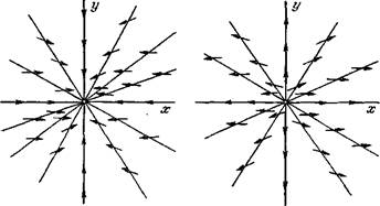 ( Пусть М (a,b) — особая точка системы (I), так что P(a,b)=Q(a,b) (13) Тогда, очевидно, х = a, у = b есть решение системы (I), и, следовательно, особая точка векторного поля сама является отдельной траекторией. Такая траектория называется состоянием равновесия *). Очевидно, также обратно, если у системы (I) есть решение х = а, y= b (14) (а и b — некоторые постоянные), то точка a, b непременно является состоянием равновесия (особой точкой векторного поля), т. е. для нее выполняются равенства (13). Решение (14), очевидно, вследствие того, что t в него не входит, определено для всех t. В дальнейшем для точек х, у области G, для которых Р (х, у) =0, Q (х, у) = 0, в основном будет использоваться термин «состояние равновесия» (а не особая точка). Состояние равновесия М
