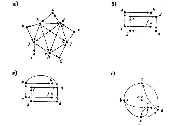 Решение: а) Граф связный, найдём степени входа и выхода вершин (по теореме 5 степени входа и выхода каждой вершины должны совпадать): indeg(a)=2, outdeg(a)=1, то есть нашлась вершина, у которой не совпадают степени входа и выхода, значит, граф не имеет эйлерова цикла. б) Граф связный, найдём степени вершин: indeg(a)=2 outdeg(a)=2 indeg(b)=2 outdeg(b)=2 indeg(c)=2 outdeg(c)=2 indeg(d)=2 outdeg(d)=2 indeg(e)=2 outdeg(e)=2 Следовательно, по теореме 5, граф имеет эйлеров цикл. в) Граф связный, найдём степени вершин: indeg(a)=2 outdeg(a)=2 indeg(b)=1 outdeg(b)=1 indeg(c)=3 outdeg(c)=1 Условия теоремы 5 не выполняются, значит, граф не имеет эйлерова цикла. г) ) Граф связный, найдём степени вершин: indeg(a)=2 outdeg(a)=1 Следовательно, т.к. условия теоремы 5 не выполняются то, граф не имеет эйлерова цикла. 8. Какие из следующих ориентированных графов имеют эйлеровы циклы? [1]
