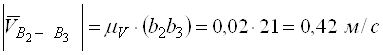 де Швидкість точки В1 складається з переносної швидкості, яка дорівнює швидкості точки В3 та відносної швидкості, яка дорівнює швидкості точки В2 відносно точки В3.