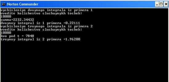 3. Листинг программы Вычисляются значения кратных интегралов из примера 2–3. program pmk; uses crt; var w, u, h, k, v, y, p, s, g, x, x2, y2, z2, niu, Integral, Integral2:real; n, m, i, a, b, e1, e2, e, e3, e4, e5:integer; begin clrscr; writeln ('vychisleniye dvoynogo integrala iz primera 1'); writeln ('vvedite kolichestvo sluchaynykh tochek:'); readln(n); for i:=1 to n do begin g:=random; p:=random; x:=g; y:=p; if ((0.5<=x) and (x<=1)) then e1:=1 else e1:=0; if ((0<=y) and (y<=2*x-1)) then e2:=1 else e2:=0; e:=e1*e2; if e=1 then s:=s+x*x+y*y; if e=1 then a:=a+1; v:=1/4; delay(1000); end; Integral:=(v/a)*(s); writeln ('summa=', s:5:5); writeln ('dvoynoy integral iz 1 primera =', Integral:5:5); writeln ('vychisleniye troynogo integrala iz primera 2'); writeln ('vvedite kolichestvo sluchaynykh tochek:'); readln(m); for i:=1 to m do begin w:=random; u:=random; h:=random; x2:=w; y2:=u; niu:=h; if niu<=0.8 then e3:=1; if (x2–0.5)*(x2–0.5)+(y2–0.5)*(y2–0.5)<=(0.5)*(0.5) then e4:=1 else e4:=0; e5:=e3*e4; if (((0.8<niu) and (niu<1)) and ((x2–0.5)*(x2–0.5)+(y2–0.5)*(y2–0.5)+6.25*(niu-0.8)*(niu-0.8)<=(0.5)*(0.5))) then e5:=1; if e5=1 then b:=b+1; delay(1000); end; Integral2:=2.5*(b/m); writeln ('kvo pod t =', b:5); writeln ('troynoy integral iz 2 primera =', Integral2:5:5); readln; end. 4. Пример работы программы при 10000 случайных точек