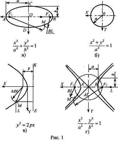 Реферат: Кривые линии и поверхности, их применение в радиоэлектронике и автоматикеРеферат: Кривые линии и поверхности, их применение в радиоэлектронике и автоматикеСодержаниеВведениеПлоские кривые линииОбщие сведения о поверхностях Поверхности вращения линейчатыеПоверхности вращения нелинейчатые Поверхности с плоскостью параллелизма Поверхности, задаваемые каркасом Пространственные кривые и плоскости Литература ВведениеКривые линии и поверхности их применение в радиоэлектронике и автоматике. Этот раздел курса имеет особое значение для графической подготовки инженера. Внешняя и внутренняя форма деталей радиоаппаратов и автоматических устройств является сочетанием гранных и кривых поверхностей. Поэтому нельзя быть грамотным конструктором, не умея задавать поверхности на чертеже, строить линии их пересечения друг с другом и с плоскостью, делать развертки поверхностей и т. д. Плоские кривые линии Можно дать несколько различных определений кривой линии как геометрическому образу. Одно из них: кривая линии есть траектория перемещающейся точки. Если кривая линия совмещается всеми точками с плоскостью, ее называют плоской. Порядком плоской алгебраической кривой считают максимальное число точек ее пересечения с прямой линией. К плоским кривым относятся все кривые второго порядка, подробно изучаемые в аналитической геометрии. На рис. 1 показано построение этих кривых и приведены их канонические уравнения. Эллипсом является геометрическое место точек М, для которых сумма расстояний до точек F1 и F2 постоянна и равна большой оси АВ (рис. 1, а). Точки F1 и F2 называют фокусами. Построим точку, принадлежащую эллипсу, если даны фокусы F1, .F2 и вершины А, В. Для этого на оси АВ берем произвольную точку L и из фокуса F1 проводим дугу окружности радиусом АL. Затем из фокуса F2 чертим дугу окружности радиусом ВL, пересекающую первую дугу в точке М. Таким образом, F1 М + F2М = АВ. При равных осях эллипс превращается в окружность, являющуюся геометрическим местом точек плоскости, равноудаленных от данной точки О (рис. 1, б). Параболой является геометрическое место точек М, для которых расстояния до точки F плоскости и до прямой КN, не проходящей через точку F, равны (рис. 1, в). Вершина О параболы делит расстояние от точки F до прямой КN пополам. Точку F называют фокусом, прямую КN -директрисой. Построим точку М, принадлежащую параболе, если дан фокус F и директриса КN. Для этого проводим прямую LМ II КN и из точки F засекаем ее дугой окружности радиусом МN. Итак, МN = МР