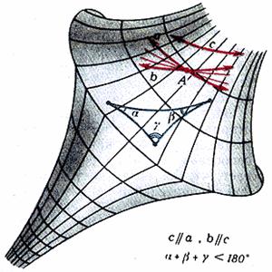 При х ® 0 , иными словами, если оставаться в пределах сравнительно небольших расстояний, то угол параллельности мало отличается от p /2 то есть от этого значения, которое он имеет в евклидовой геометрии, это означает, что геометрия Лобачевского не противоречит, не исключает геометрии Евклида; последнего можно рассматривать как частный случай большой общей геометрии – геометрии Лобачевского. Реальный смысл предельного перехода (при х ® 0) от геометрии Лобачевского к геометрии Евклида состоит в том, что физика изучает, в конечном счете, только ограниченную, сравнительно небольшую часть пространства. Вот почему в окружающей нас среде (даже в пределах нашей планеты) свойства физического пространства приблизительно таковы, какими мы их знаем из Евклидовой геометрии, но для всего пространства, для мира звезд, для вселенной в целом, они иные, неевклидовы. 2) Сумма углов треугольника меньше 2π.