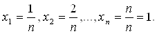 Пример 1. Вычислить площадь, заключенную между прямой y=x, осью Ox и прямой x=1. Решение. Так как данная прямая пересекается с Ox в начале координат, то отрезок интегрирования здесь будет [0, 1]. 1). Разбиением этого отрезка на n равных между собой частей получим точки деления с абсциссами: