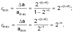 Следовательно, в отличие от машин с фиксированной запятой, в машинах с плавающей запятой абсолютная погрешность представления чисел зависит от порядка числа: минимальная при наибольшем отрицательном m и максимальная при наибольшем положительном определяются следующим образом:
