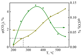 Рис. 4. Залежність об'ємної концентрації CO2 і CO від температури для сплаву Pd – Ni (щ(Ni)=20%) на 12Х18Н10Т Температурні залежності концентрації ди- і монооксиду карбону у вихідних газах свідчать, що температура «запалювання», яка відповідає досягненню об'ємної частки оксиду карбону (IV) ц(CO2) = 1 %, знижується на електролітичних сплавах Pd – Ni на 130 єC (рис. 4) у порівнянні з паладійвмісним каталіза-тором на керамічному носії. Глибина окиснення бензолу на електролітичних сплавах, характеристикою якої служить ц(CO2), зростає практично вдвічі. При цьому у вихідних газах відсутні оксиди нітрогену. Подальші випробування каталітичних властивостей покриттів було проведено в процесі конверсії головних шкідливих компонентів вихідних газів двигунів внутрішнього згоряння в процесі неселективного очищення їх викидів від оксиду карбону(II) та оксидів нітрогену (табл. 5). Таблиця 5 Випробування каталітичної активності паладійвмісного покриття