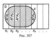§11. Формула повної ймовірності Припустимо, що подія A може настати тільки разом з однією із попарно несумісних подій H1, H2,... Нп, які утворюють повну групу подій (рис. 307). Теорема. Ймовірність події A, яка може настати лише за умови появи однієї із попарно несумісних подій Н1, H2, ... Нп, які утворюють повну групу, визначається за формулою Р(А) = Р(А/Н1)·Р(Н1) + Р(А/Н2) ·Р(Н2) + ...+ Р(А/Нп) ·Р(Нп). (1) Якщо подія А відбулася разом з однією із подій H1, H2,... Нп, то це означає, що відбулася одна із попарно несумісних подій A∩H1, A∩ H2,... A∩Нп. Отже,
