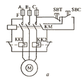 Рис. 7.6. Шабровка вкладыша: а – правильная шабровка; б – неправильная шабровка; 1 – поверхность касания; 2 – карманы Для электродвигатели, установленных в помещении, наряду с указанными смазками широко применяют универсальную тугоплавкую водостойкую смазку марки УТВ (1... 13). Сравнительно частой причиной преждевременного выхода из строя подшипников качения является их неправильная посадка на вал. В двигателях с частотой вращения 1500 об/мин и ниже чаще всего применяется напряженная посадка подшипников на вал и плотная в торцевой крышке. В двигателях с частотой вращения 3000 об/мин и менее применяются посадки с меньшим натягом: плотная посадка на вал и посадка скольжения - в торцевой крышке. Двигатели, имеющие пониженное значение сопротивления изоляции, подвергаются сушке. В условиях эксплуатации чаще всего сушка проводится путем их внешнего нагревания, т.е. подачей горячего воздуха в двигатель через имеющиеся проемы или люки от воздуходувки либо путем включения обмотки статора на пониженное напряжение. Лучших результатов можно добиться при одновременном применении обоих способов. Двигатели напряжением 6 и 10 кВ при сушке включают на 380... 500 В, двигатели напряжением 3 кВ - на 220 В, а двигатели напряжением 380 В - на 36 В. Температура обмотки во время сушки не должна превышать 90 С, если она определяется путем измерения сопротивления, и 70 С при измерении термометром. Контроль сушки ведется по изменению сопротивления изоляции. Сушка считается законченной, когда сопротивление изоляции после его понижения до минимального значения и последующего увеличения в течение нескольких часов остается неизменным. Двигатели напряжением 0,4 кВ включают и отключают неавтоматизированными выключателями непосредственно в месте их установки, а дистанционно - автоматизированными выключателями АВМ, АВ2М, «Электрон» и другими, а также магнитными пускателями. Рассмотрим включение и отключение электродвигателей пускателями При нереверсивном управлении для пуска электродвигателя М нажимают на кнопку SBC (рис. 7.7, а), замыкающую цепь питания катушки магнитного пускателя КМ, который включается и замыкает свои силовые контакты и вспомогательный контакт, шунтирующий кнопку SBC. После отпускания ее магнитный пускатель удерживается во включенном положении. Отключение электродвигателя М произойдет при нажатии кнопки SBT, размыкающей цепь катушки магнитного пускателя КМ, или при срабатывании электротепловых реле КК1 и КК2 (при недопустимой перегрузке электродвигателя), размыкающих свои контакты в цепи управления. В схеме реверсивного управления электродвигателем (рис. 7.7, б) предусмотрена электрическая блокировка, исключающая одновременное включение контакторов КМ1 и КМ2 (на кнопках SBC1 и SBC2 имеются дополнительные размыкающие и вспомогательные контакты). Для пуска электродвигателя М с вращением в одну сторону нажимают на кнопку SBC1, при этом образуется цепь питания катушки контактора КМ1, который срабатывает и переключает вспомогательные контакты КМ1:1 и КМ1:2 (соответственно один замкнется, а другой разомкнется). После отпускания кнопки SBC1 контактор КМ1 останется включенным. Катушка контактора КМ2 не подключается к сети, так как остаются разомкнутыми контакты SBC2:1, SBC1:2, КМ2:1, КМ1:2. Отключение электродвигателя М может произойти от теплового реле КК1 или КК2 (рис. 7.7, в) 