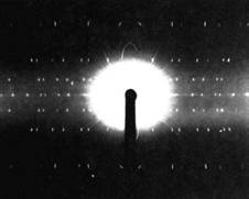 Рис. 7. ЛАУЭГРАММА. Через неподвижный кристалл пропускается рентгеновское излучение широкого спектрального диапазона. Дифракционным пучкам соответствуют пятна на лауэграмме. Метод Дебая – Шеррера (для поликристаллических образцов). В отличие от предыдущего метода, здесь используется монохроматическое излучение (l = const), а варьируется угол q. Это достигается использованием поликристаллического образца, состоящего из многочисленных мелких кристаллитов случайной ориентации, среди которых имеются и удовлетворяющие условию Брэгга – Вульфа. Дифрагированные пучки образуют конусы, ось которых направлена вдоль пучка рентгеновского излучения. Для съемки обычно используется узкая полоска рентгеновской пленки в цилиндрической кассете, а рентгеновские лучи распространяются по диаметру через отверстия в пленке. Полученная таким образом дебаеграмма (рис. 8) содержит точную информацию о периоде d, т.е. о структуре кристалла, но не дает информации, которую содержит лауэграмма. Поэтому оба метода взаимно дополняют друг друга. Рассмотрим некоторые применения метода Дебая – Шеррера.