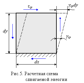 В частном случае чистого сдвига в плоскости Оху, изображенном на рис. 5, сила xydxdz совершает работу на перемещении xydy. Соответствующая этому случаю удельная потенциальная энергия деформации равна