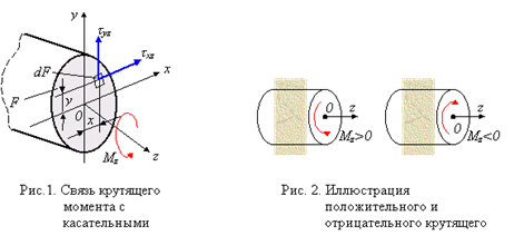 получим 2n граничных условий, необходимых для нахождения постоянных интегрирования. Рекомендую для практики решения дифференциальных уравнений второго порядка воспользоваться системой входных тестов Т-6, приведенных в ПРИЛОЖЕНИИ. 11. Напряжения и деформации при кручении призматических стержней кругового поперечного сечения Ключевые слова: чистый сдвиг, жесткость сечения при кручении, угол закручивания, вал, прочность, жесткость. Кручением называется такой вид деформации, при котором в поперечном сечении стержня возникает лишь один силовой фактор - крутящий момент Мz. Крутящий момент по определению равен сумме моментов внутренних сил относительно продольной оси стержня Oz. Нормальные силы, параллельные оси Oz, вклада в крутящий момент не вносят. С силами, лежащими в плоскости поперечного сечения стержня (интенсивности этих сил - касательные напряжения xz и yz) Мz связывает вытекающее из его определения уравнение равновесия статики (рис. 1)