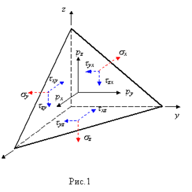 С учетом соотношений (1) после сокращения на dF получим уравнение, связывающее проекцию рx вектора напряжений с соответствующими компонентами тензора напряжений. Объединяя это уравнение с двумя аналогичными уравнениями, полученными проектированием сил на оси Оy и Оz, приходим к следующим соотношениям