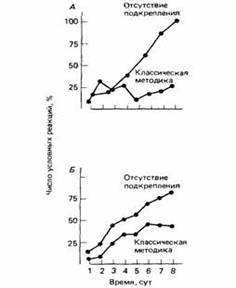 Рис. 5. Сравнение классической методики подкрепления и методики его отмены. А. Бег морских свинок в колесе, Б. Условнорефлекторное сгибание ноги у собаки. Крысы стараются избегать незнакомой пищи и пробовать ее осторожно. Животное, проглотившее небольшой кусочек отравленного корма и выжившее, никогда больше не притронется к нему. Ревуски и Гарсия так описывают лабораторные опыты, демонстрирующие такое поведение: «Животному дают проглотить пищу с характерным вкусом, например раствор сахарина, а затем подвергают его неблагоприятному последействию, вызываемому такими независимыми от еды средствами, как инъекция яда или рентгеновское облучение. Оправившись, животное будет избегать вещество с этим вкусом. Крыса ведет себя так, как будто думает, что заболела, поев его. Это специфическое отвращение не возникнет, если ухудшение здоровья наступило без предварительного поедания особой пищи или если после ее поедания самочувствие не изменилось. Этот механизм отличается от обычно исследуемых типов научения тем, что может наступить после одного сочетания, даже если между поеданием корма и ухудшением здоровья проходит несколько часов». Мало что известно о природе внутренних сигналов, с помощью которых животное оценивает свое относительно болезненное или здоровое состояние. Трейсмен предположил, что тошнота и рвота, которые характерны для морской болезни человека и возникают при ненормальной зрительно-вестибулярной стимуляции, происходят потому, что для животного одним из первых показателей отравления является нарушение в вестибулярной системе. Поэтому рвота служит для удаления всякого яда из этой системы, а возникающее вслед за этим угнетенное состояние заставляет животное сохранять покой во время выздоровления. Таким образом, Трейсмен полагает, что у вестибулярной системы, особенно чувствительной и подверженной проникновению мелких молекул, развилась вторая функция - детектора яда. Эта гипотеза еще нуждается в подтверждении. Болезнь можно считать функцией общего физиологического состояния животного. Можно предположить, что именно степень изменения этой функции животное связывает с пищевыми стимулами. Такой ход рассуждений ведет к следующему выводу: «Животное не может одновременно научиться предпочитать вещества с определенным вкусом на основе улучшения физиологического состояния и избегать их на противоположной основе. Эти два процесса просто будут гасить друг друга. Например, животное, научаясь избегать определенный вкус из-за следующей за ним болезни, должно также научиться приближаться к источнику этого вкуса после выздоровления». Розин и Кейлат отмечают, что многие данные, которые, казалось бы, свидетельствуют о положительных предпочтениях, можно истолковать как примеры выработанного отвращения. Проблема состоит в том, что во многих опытах по проверке предпочтений крысы лишены должного выбора. Загорик и Майер позволяли им выбирать между вкусом, связанным с выздоровлением после недостатка какого-либо вещества, вкусом, связанным с таким недостатком, и новым вкусом. Однако крысы не получали корма со знакомым им «безвредным» вкусом. Поэтому возможно, что кажущееся предпочтение пищи, приводящей к выздоровлению, объяснялось просто избеганием крысами остальных видов корма. В ряде работ сделаны попытки про