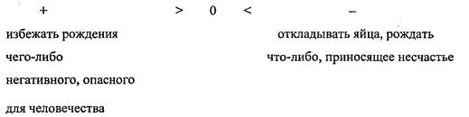 В данном случае положительные ассоциации возникают в сознании благодаря тому, что всегда приятно быть победителем, способным уничтожить врага своей «взрывной силой» и мощью. Анализ оценки в семантическом объеме метафоры позволяет сделать вывод об использовании сравнительно небольшого количества метафор с положительной окрашенностью. Это объясняется как объективным научным характером текстов, так и природой оценки. Рассмотрим метафоры-слова с отрицательной окрашенностью в медиа-текстах научного характера: Английская метафора-слово 'spawn' носит явный негативный оттенок в предложении: Thus, a homeowner will probably not be able to show that the hurricane that destroyed his house was spawned by global warming,...(SAGS 2003). Это можно проиллюстрировать, изобразив данную метафору на оценочной шкале: