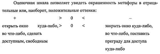Традиционно рождение всегда связано с чем-либо положительным: продолжением рода, детьми, приносящими счастье и приятные заботы. Однако в данном контексте речь идет о порождении зла, что, естественно, имеет отрицательные коннотации, т.е. семантическая амплитуда слова меняется с положительной на отрицательную под влиянием дистрибутивного окружения глагола ''spawn' — ураган, уничтоживший дом, оставшийся без крова человек и глобальное потепление. Проанализируем метафоры-слова с нейтральной окрашенностью: Then comes the cable (SDSE 2001). - Затем следует (идет) кабель. Расположение метафоры на оценочной прямой будет находиться в области нормы. Это связано с угасанием метафоричности английского глагола to go («идти, следовать»), который очень давно подвергся процессу метафоризации на основе принципа антропоморфности. В результате этого многие явления действительности смогли «ходить», «двигаться», словно живые существа, например: 'When the day comes...', 'the moon /goes along the sky'. Подобные примеры можно встретить и в русском языке, например: «Идет дождь / снег», «Как прошел урок?», «Часы идут». Однако на сегодняшний день глагол Чо go' растерял все свои коннотативные признаки, поэтому для нас оказывается вполне естественным при перечислении чего-либо сказать: «А затем (теперь) следует (идет)...». Также и здесь - то, что «кабель идет» (т.е. теперь очередь рассмотреть, изучить кабель) воспринимается как нечто вполне реальное, не выходящее за рамки нормы событие: