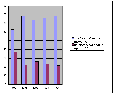 Рис.2.1 Співвідношення груп галузей "А" і "Б" у структурі промислової продукції України (%) У фактичних цінах частка виробництва засобів виробництва не тільки не зменшилась, а навпаки зросла до 78,3%, з частка виробництва предметів споживання - впала до 21,7%, тобто тенденція є прямо протилежною тій, якої прагнули. Розрахунки за порівнянними цінами дали збільшення частки випуску предметів споживання в 1995 р. на дуже незначну величину (на 0,3%) рівня проти 1990 р. Але такі, вкрай незначні, структурні зміни не справили відчутного впливу на стан внутрішнього споживчого ринку за рахунок власних товаровиробників. Його насиченість формується переважно за рахунок імпорту, який витісняє з ринку вітчизняні товари. Таким чином, поки що переорієнтація промислової структури в соціальному напрямі не відбулася. В наступній перспективі, за попередніми розрахунками, слід було б частку промислового виробництва групи "А" знизити, як мінімум, до 55-60% з одночасним поліпшенням їх технологічної і структурної якості, а частину галузей групи "Б" - відповідно підвищити до 40-45%. Ефективна макроструктура трансформується досить повільно і далеко не в кращому напрямі. Про це свідчать також тенденції структурних змін у вирішальних агрегованих сферах господарської діяльності (див. табл.2.3) [19,77]. Таблиця 2.3 Зміни в агрегованій структурі економіки України за п’ять років її трансформації (у фактичних цінах) (%)