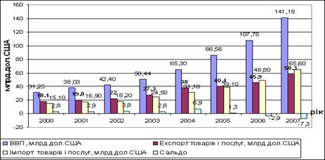 Рис. 1.1 Динаміка зовнішньоекономічної діяльності України за 2000-2007 рр. 1.2 Сучасний стан зовнішньої торгівлі регіонів України На сьогодні структуру українського експорту визначає сировинна спрямованість. Разом з тим вивіз із України традиційних сировинних товарів має свої межі, і основна мета заходів і намічуваних програм складається в збільшенні вартісного обсягу українського експорту й, насамперед, за рахунок продукції з підвищеним ступенем обробки, наукомістких товарів, технологій і послуг. Україна за роки незалежності здійснила значний поступ у розвитку зовнішньої торгівлі. З огляду на це постає питання про ефективність міжнародного товарообміну, його вплив на розвиток соціально-економічних процесів у державі. З'ясування цих питань є важливим у зв'язку із формуванням зовнішньоекономічної політики, вибором моделі економічного розвитку країни. Найбільша частка експорту з України припадає на недорогоцінні метали та вироби з них – 44,6% до загального обсягу. За даними Держкомстату, за січень-квітень 2008 року сума експорту цієї групи товарів перевищила $8,6 млрд. На другому місці із суттєвим відставанням у 4,5 рази – машини, обладнання, пристрої для записування або відтворення зображення і звуку. Частка їх експорту становить 9,9%, сума – майже 2 млрд. Наступну групу формують мінеральні продукти й товари хімічної промисловості з часткою експорту відповідно 8,6% та 8,3%. До переліку товарів, котрі продаються за кордон і за часткою в структурі експорту перевищують 2%, увійшли транспортні засоби та шляхове обладнання (6,7%), готові харчові продукти (3,8%), жири та олії тваринного або рослинного походження (3,5%), продукти рослинного походження (2,9%), полімерні матеріали, пластмаси та каучук (2%). За 2008р. експорт товарів склав 67002,5 млн.дол. США, імпорт – 85534,4 млн.дол. США. Порівняно з 2007р. експорт збільшився на 35,9%, імпорт – на 41,1%. Від’ємне сальдо становило – 18531,9 млн.дол. (за 2007р. – 11321,9 млн.дол.). На формування від’ємного сальдо у зовнішній торгівлі вплинули окремі товарні групи: енергетичні матеріали; нафта та продукти її перегонки (–18722,9 млн.дол.), наземні транспортні засоби, крім залізничних (–10126,4 млн.дол.) та механічне обладнання (–6072,5 млн.дол.). Коефіцієнт покриття експортом імпорту склав 0,78 (за 2007р. – 0,81). Зовнішньоторговельні операції проводились з партнерами із 217 країн світу. Обсяги експортних поставок до країн СНД становили 35,5% від загального обсягу експорту, Європи – 29,5% (у т.ч. до країн Європейського Союзу – 27,1%), Азії – 22,8%, Америки – 6,2%, Африки – 5,8% та Австраліі і Океаніі – 0,1%. У порівнянні з 2007р. збільшились обсяги експорту товарів до Австралії і Океанії (у 4,1 раза), Америки (на 54,3%), Азії (на 47,4%), Африки (на 39,8%), країн Європи (на 33,6%), СНД (на 28%). Найбільші обсяги експортних поставок здійснювались до Російської Федерації – 23,5% від загального обсягу експорту, Туреччини – 6,9%, Італії – 4,3%, Польщі – 3,5%, Білорусі –3,1%, Сполучених Штатів Америки – 2,9%, Німеччини – 2,7%.(рис.1.2) Порівняно з 2007р. збільшився експорт товарів до найбільших країн-партнерів: Сполучених Штатів Америки – на 84,2% (за рахунок збільшення поставок чорних металів та виробів з них, продуктів неорганічної хімії), Польщі – на 42,8%, Білорусі – на 34,8%, Туреччини – на 27,1%, Російської Федерації – на 24,2%, Німеччини – на 11,7%, Італії – на 8,8%.