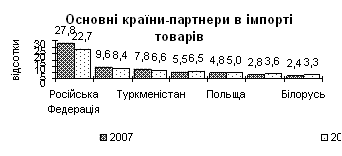Імпорт з країн СНД становив 39,2% від загального його обсягу, Європи – 35,6% (у т.ч. з країн Європейського Союзу - 33,7%), Азії - 17,9%, Америки – 4,9%, Африки – 1,8%, Австралії і Океанії – 0,5%. Збільшились обсяги імпортних надходжень в Україну з Австралії і Океанії (у 3,4 раза), Африки (у 2,3 раза), Америки (на 85,8%), Азії (на 71,2%), Європи (на 32,2%), країн СНД (на 31,3%). Найбільші імпортні надходження здійснювались з Російської Федерації - 22,7%, Німеччини - 8,4%, Туркменістану – 6,6%, Китаю – 6,5%, Польщі – 5%, Казахстану - 3,6%, Білорусі – 3,3%.