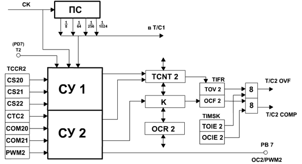 Рисунок 2.3 – Структурная схема таймера/счетчика типа В Тактовый сигнал микроконтроллера СК поступает в пересчетную схему ПС, где частота сигнала делится на 8, 64, 256 и 1024. Сигналы с четырех выходов пересчетной схемы поступают в схему управления СУ1 и в таймер/счетчик Т/С1 типа Е. В схему управления СУ1 поступают также тактовый сигнал СК и сигнал из внешнего источника, принимаемый на вход Т2 (вывод порта PD7). При выполнении функции сравнения/PWM вывод порта РВ7 используется в качестве выхода OC2/PWM2 для выдачи сигнала, формируемого при совпадении сравниваемых кодов или сигнала PWM2. Схема управления СУ1 в зависимости от комбинации состояний разрядов CS20, CS21 и CS22 регистра управления TCCR2 передает на счетный вход базового счетчика TCNT2 один из поступающих сигналов в соответствии с таблицей 2.1 при (Х = 2). При переполнении базового счетчика устанавливается в единичное состояние разряд TOV2 регистра TIFR и при единичном состоянии разряда TOIE2 регистра TIMSK в блок прерываний поступает запрос прерывания Т/С2 OVF. Режим работы таймера/счетчика определяется комбинацией состояний разрядов PWM2, СОМ21 и СОМ20 регистра TCCR2. При нулевом состоянии трех названных разрядов формируется только запрос прерывания Т/С2 OVF. При PWM2 = 0 и других комбинациях состоянии разрядов СОМ21 и СОМ20 выполняется функция сравнения. Код, формируемый в базовом счетчике TCNT2, с помощью компаратора К сравнивается с кодом, записанным в регистре OCR2. При совпадении кодов устанавливается определенное значение сигнала на выходе ОС2 (вывод порта РВ7), переводится в единичное состояние разряд OCF2 регистра TFR и при единичном состоянии разряда OCIE2 регистра TIMSK в блок прерываний поступает запрос прерывания Т/С2 СОМР. Значение сигнала, устанавливаемого на выходе ОС2 при совпадении кодов, определяется комбинацией состояний разрядов СОМ20 и СОМ21 регистра TCCR2 в соответствии с таблицей 2.2. Таблица 2.2 – Комбинации состояний разрядов СОМ20 и СОМ21 регистра TCCR2