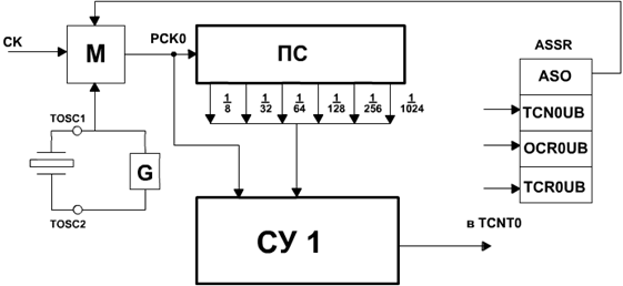 Рисунок 2.6 – Структурная схема таймера счетчика типа C В качестве исходного сигнала для работы базового счетчика TCNT 0 может использоваться тактовый сигнал микроконтроллера СК или сигнал TOSC1 из дополнительного внутреннего генератора G, к которому через выводы TOSC1 и TOSC2 подключен кварцевый резонатор КР2. При частоте резонатора 32768 Гц ("часовой" кварц) параметры процессов в таймере/счетчике с высокой точностью привязаны к единице измерения реального времени – секунде. При нулевом состоянии разряда AS0 регистра ASSR используется тактовый сигнал СК, при единичном состоянии – сигнал генератора G (режим реального времени). Выбранный сигнал РСК0 с выхода мультиплексора М поступает в пересчетную схему ПС, в котором выполняется деление частоты на 8, 32, 64, 128, 256 и 1024. Сигналы с шести выходов пересчетной схемы и сигнал с выхода мультиплексора поступают в схему управления СУ1. Выбор сигнала для передачи на счетный вход базового счетчика определяется комбинацией состояний разрядов CS00, CS01 и CS02 регистра управления TCCR0 в соответствии с таблицей 2.4 Таблица 2.4 – Комбинации состояний разрядов CS00, CS01 и CS02 регистра управления TCCR0