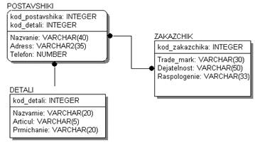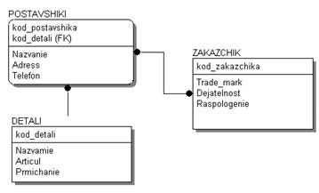Рис. 3.1 Фізична схема зв’язків 3.3 Класифікація зв'язків Для побудови інфологічної моделі даних визначимо сутності їхнього зв'язку й атрибути. Визначимо сутності: 1. поставщіки, які займаються постачанням; 2. замовники, котрі замовляють деталі; 3. деталі, які будуть продані замовнику; Опишемо атрибути сутностей для кожної окремо: - ПОСТАВЩІКИ (код постачальника, назва, адреса, телефон); - ДЕТАЛІ (код деталі, назва, артикул примітка); - ЗАМОВНИК (код замовника, торгова марка, діяльність, місце знаходження). РОЗДІЛ 4 ПРОЕКТУВАННЯ РЕЛЯЦІЙНОЇ SQL-МОДЕЛІ Даний розділ присвячений проектуванню реляційної SQL-модели. Тут виконується переклад глобальної ER-моделі в реляційну форму, специфікуються обмеження і правила підтримки цілісності на реляційному рівні, записується SQL-код для створення реляційної моделі. 4.1 Функціональні залежності між атрибутами Наша база даних складається з трьох таблиць. Первинними серед них є DETALI. Вона заповнюються першими. У таблиці – DETALI – зберігаються данні про деталі. У другій – ZAKAZCHIK – зберігається інформація про замовників підприємства.У таблиці POSTAVSHIKI йдеться про причасність робітників магазину до продаваємих деталій. Ця таблиця залежить і від таблиці DETALI. Установимо функціональні залежності між атрибутами. ідентифікатор працівника → (ПІП, домашня адреса, досвіт роботи, рік народження, освіта, примітки, фото); ідентифікатор замовника → (назва підприємства замовника, телефон, банк, номер рахунку в банку, код ЄДРОПУ, адреса, відповідальний за замовлення, телефон відповідального); ідентифікатор замовника → ідентифікатор проекту (назва проекту, дата початку та кінця проекту, керівник, замовник проекту, вартість розробки та премія за дострокове виконання). 4.2 Вибір ключів Постачальники (*ідентифікатор постачальника, домашня адреса, досвіт роботи, рік народження, освіта, примітки, фото); Поставка (*ідентифікатор поставки, назва поставки, дата початку та кінця поставки керівник, замовник поставки, вартість поставки); Деталі (*ідентифікатор деталі, назва деталі, артикул, вартість деталі, опис деталі). 4.3 Нормалізація відносин Ті самі дані можуть групуватися в таблиці (відносини) різними способами, тобто можлива організація різних наборів відносин взаємозалежних інформаційних об'єктів. Угруповання атрибутів у відносинах повинна бути раціональної, тобто зменшуючи дублювання даних і процедури, що спрощує, їхньої обробки й відновлення. Певний набір відносин має кращі властивості при включенні, модифікації, видаленні даних, чим всі інші можливі набори відносин, якщо він відповідає вимогам нормалізації відносин. Нормалізація відносин - формальний апарат обмежень на формування відносин (таблиць), що дозволяє усунути дублювання, забезпечує несуперечність збережених у базі даних, зменшує трудозатрати на ведення (уведення, коректування) бази даних. Поняття третьої нормальної форми ґрунтується на понятті нетранзитивної залежності. Транзитивна залежність спостерігається в тому випадку, якщо один із двох описових реквізитів залежить від ключа, а інший описовий реквізит залежить від першого описового реквізиту. Відношення буде перебувати в третій нормальній формі, якщо воно перебуває в другій нормальній формі, і кожний не ключовий атрибут нетранзитивно залежить від первинного ключа. Для усунення транзитивної залежнос