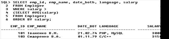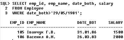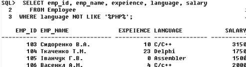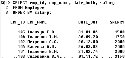 5.2 Засоби підтримки цілісності У даному підрозділі для значень атрибутів виявляються обмеження й правила на рівні атрибутів, обраних у попередньому розділі. У першу чергу шляхом аналізу окремих атрибутів визначаються характеристики доменів, з яких атрибути об'єктів, що беруть участь у виконанні автоматизуємих функцій, беруть свої значення. Далі аналізуються можливі змінення значень атрибутів з метою виявлення динамічних обмежень і операційних правил, що ставляться до окремих атрибутів. Взагалі, у цілісній частині реляційної моделі даних фіксуються дві базових вимоги цілісності, які повинні підтримуватися в будь-який реляційної СУБД. Перша вимога називається вимогою цілісності сутностей. Об'єкту або сутності реального миру в реляційних БД відповідають кортежі відносин. Конкретна вимога полягає в тому, що будь-який кортеж будь-якого відношення відрізнимо від будь-якого іншого кортежу цього відношення, тобто інакше кажучи, будь-яке відношення повинне мати первинний ключ. Друга вимога називається вимогою цілісності по посиланнях і є трохи більше складним. Очевидно, що при дотриманні нормалізованісті відносин складні сутності реального миру представляються в реляційної БД у вигляді декількох кортежів декількох відносин. Так, первинним ключем у нас у таблиці «Postavshiki» є атрибут «cod_postavshika», ця таблиця є батьківською для дочірній таблиці «detali» з її первинним ключем «cod_detali»; зв’язуються вони через зовнішній ключ «cod_detali». У таблиці «zakazchiki» первинним ключем є атрибут «cod_zakazchika», звьяхується з таблицєю «Postavshiki» з її первинним ключем «cod_postavshika»; зв’язуються вони через зовнішній ключ. При заповненні полів бази даних існують такі правила. 1) Поля з назвами, заповнюються українськими або англійськими буквами. Перша буква прописна, інші – рядкові); можливі подвійні назви, розділені дефісом; багатослівні назви, розділені пробілами. 2) Адреса записується в такому форматі: країна, індекс, місто, вулиця, номер будинку, номер корпусу, номер квартири. 3) Ідентифікатори розпочинаються з числа 01 та збільшуються на одиницю. 4) Можливі роздільники – пробіли . 5) Дата записується у форматі: д/м/р. 6) Номера телефонів: +(код країни – код міста) номер телефону. 7) Якщо поле розпочинається з букви, то у випадку ім’я власного – перша літера прописна, в іншому – строкова. РОЗДІЛ 6 ЗАПИТИ ДО БД В даному пункті відпрацюємо деякі запити, які можуть бути розроблені користувачами бази даних. Складемо такі SQL-запити: 1) Проста вибірка. 2) Вибірка з умовою. 3) Вибірка даних зі зв'язаних таблиць. 4) Вибірка з використанням оператора (природного) з'єднання. 5) Вибірка з використанням шаблона. 1.1) Вивести список робітників, відсортированих за розміром з/п.